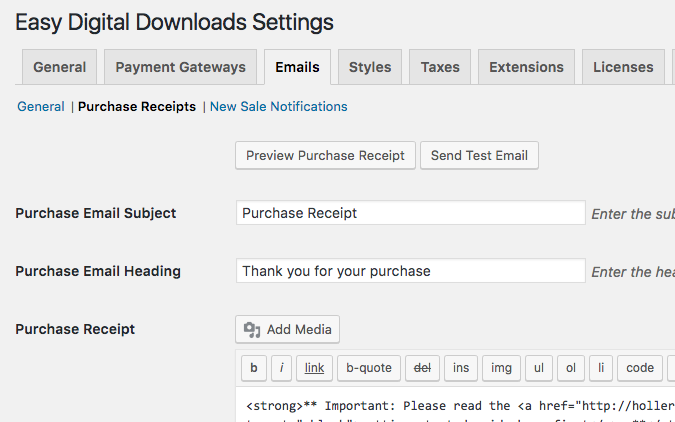 ایمیلهای ارسالی توسط edd بسیار ساده و ابتدایی است. برای شخصیسازی بیشتر این ایمیلها میتوانید از افزونه ایمیل به ازای محصول استفاده کنید که در بسته موجود است. با نصب این افزونه دهها قالب آماده در اختیارتان قرار میگیرد که میتوانید ظاهر ایمیلهای ارسالی را دگرگون کرده و آن را متناسب با شمایل فروشگاه و برند خود درآورید.