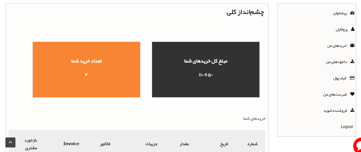 معمولا داشبورد کاربری edd بسیار ساده و حتی زشت است. مگر آن که بعضی از قالبها به آنها استایل داده باشند. اما یک افزونه اختصاصی در بستهای که پیش از این ذکر کردیم وجود دارد که تولید گروه فرشمی است. این افزونه پیشخوان مشتریان نام دارد که یک پنل حرفهای و زیبا و کارآمد برای مشتریان فروشگاهتان ایجاد میکند که در آنجا به پروفایل، خریدها لینکهای دانلود، فاکتورها، لایسنسها، کیف پول، فهرست علاقهمندیها و سایر موارد دسترسی دارند.
