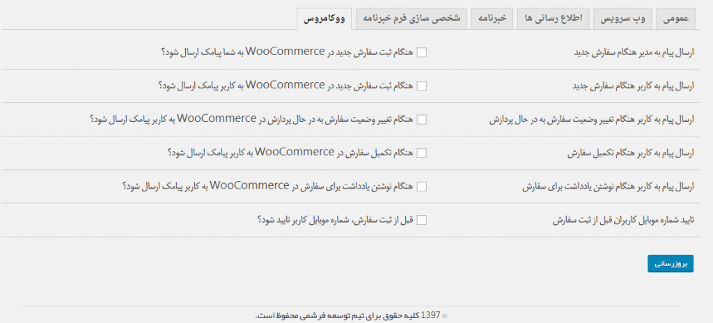 برای تنظیمات مربوط به ووکامرس نیز به تب ووکامرس در بخش تنظیمات بروید و هر کدام از اطلاعرسانیهایی که میخواهید انجام شود را تیک بزنید. پس از تیک نیز٬ متن پیامک ارسالی را به داخواه خود ویرایش کنید.