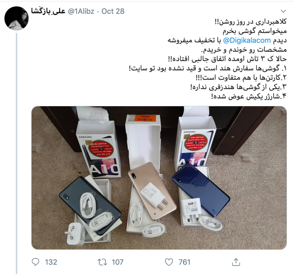 اما یکی دیگر از ایراداتی که به دیجیکالا گرفته میشود درباره کیفیت کالاهای ارسالی٬ و مغایرت آن با توضیحات درج شده محصول در سایت میباشد. یکی از توییتهایی که بازخورد زیادی داشته اظهار میکند از یک کالا سه عدد خریداری کرده٬ اما کالاهای ارسال شده با یکدیگر مغایرت دارند: