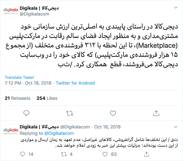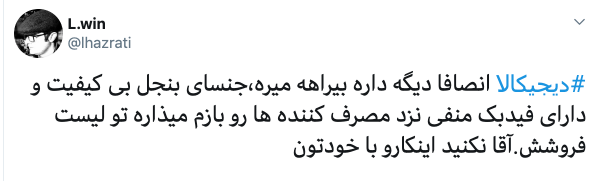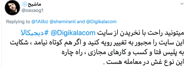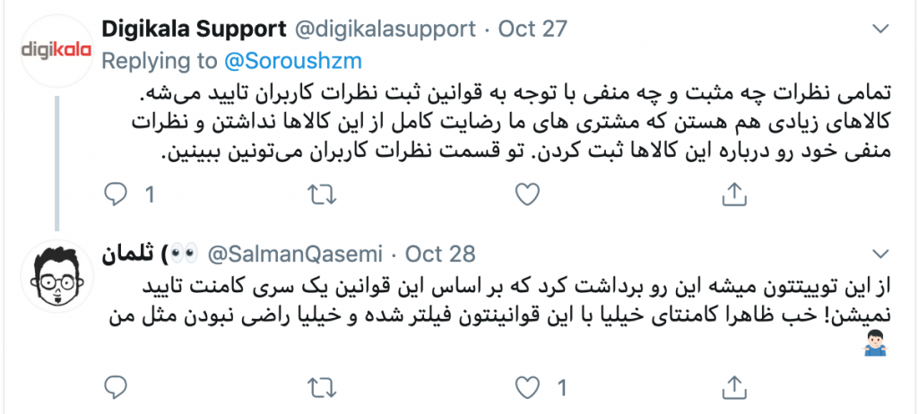 در ذیل همین توییت٬ نظراتی مبنی بر نارضایتی از خدمات٬ کلاهبرداری و عبارات و مضامینی از این دست درباره دیجیکالا به چشم میخورد. دیجیکالا در پاسخ به نظراتی که اظهار میکنند اصالت کالاها و همچنین کیفیتشان – درباره فروشنده های ثالث – دارای مشکل است ادعا میکند بر محصولات تا حد امکان نظارت میکند اما چون بسته ها را باز نمیکند نمیتواند اصالت کالا را در هنگام ارسال تضمین کند اما در صورت وجود مشکل٬ با خدمات پس از فروش خود در صدد جبران مافات برآمده و با فروشنده خاطی برخورد میکند. اما یکی از کاربران نظری غیر از این دارد:
