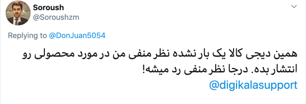 همان طور که مشاهده میکنید این کاربر ادعا میکند که هیچکدام از نظرات منفی درباره کالاها٬ تایید و منتشر نمیشوند. پاسخ دیجیکالا به این اتهام و پاسخ یک کاربر به این واکنش نیز درخورد توجه است: