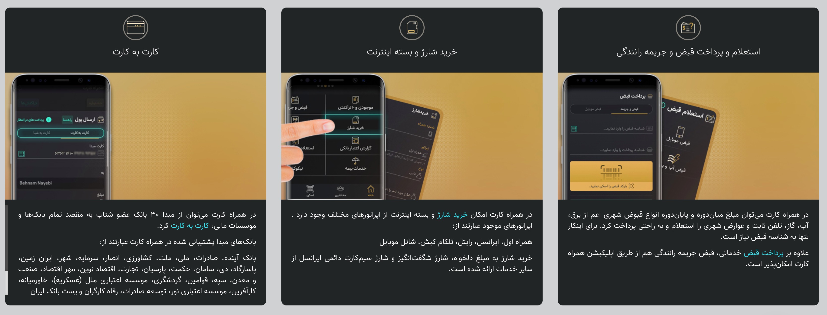 اپلیکیشن همراه بانک، بهترین اپلیکیشنی است که برای انجام امور بانکی خود میتوانید از آن استفاده کنید. ما اغلب اپهای موجود در این زمینه را آزمایش کردیم و به این نتیجه رسیدیم که از این اپ استفاده کنیم. اپ همراه بانک در واقع یک کیف پول و کیف کارت همراه است. شما میتوانید تمام کارتهای بانکی خود را در اپ ثبت کنید (چه به صورت دستی از طریق وارد کردن اطلاعات و چه از طریق دوربین – تنها کافی است دوربین گوشی را روی کارت بگیرید و اطلاعات به صورت خودکار توسط اپ اخذ میشود). میبینید که چه قدر ساده میتوانید تمام کارتهای خود را در اپ وارد کنید و دیگر نیازی به حضور فیزیکی کارتها نداشته باشید. حالا تمام عملیات بانکی را به جای کارت میتوانید با استفاده از اپ انجام دهید.